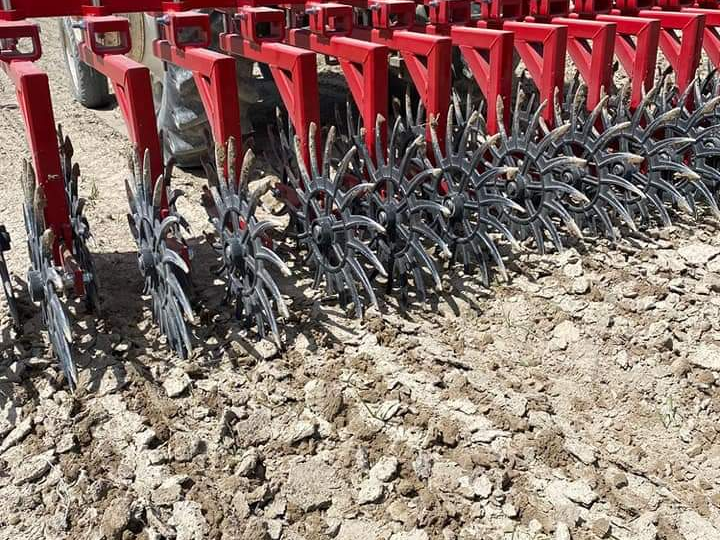 Rotary hoe - shallow cultivator that eliminates weeds that are closer to the surface without damaging your crops, it also helps to break up the soil for plant emergence.
